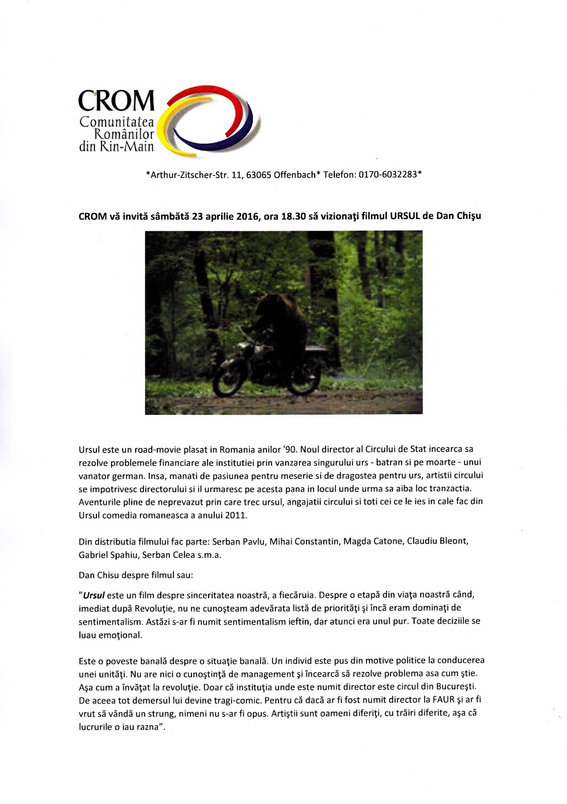 Invitatie la film - Ursul de Dan Chisu, sambata 23 aprilie 2016, 18.30 h - la CROM/Einladung zum FIlm, Samstag den 23. April 2016, 18.30 Uhr Solicitați un link Facebook X Pinterest E-mail Alte aplicații Solicitați un link Facebook X Pinterest E-mail Alte aplicații
