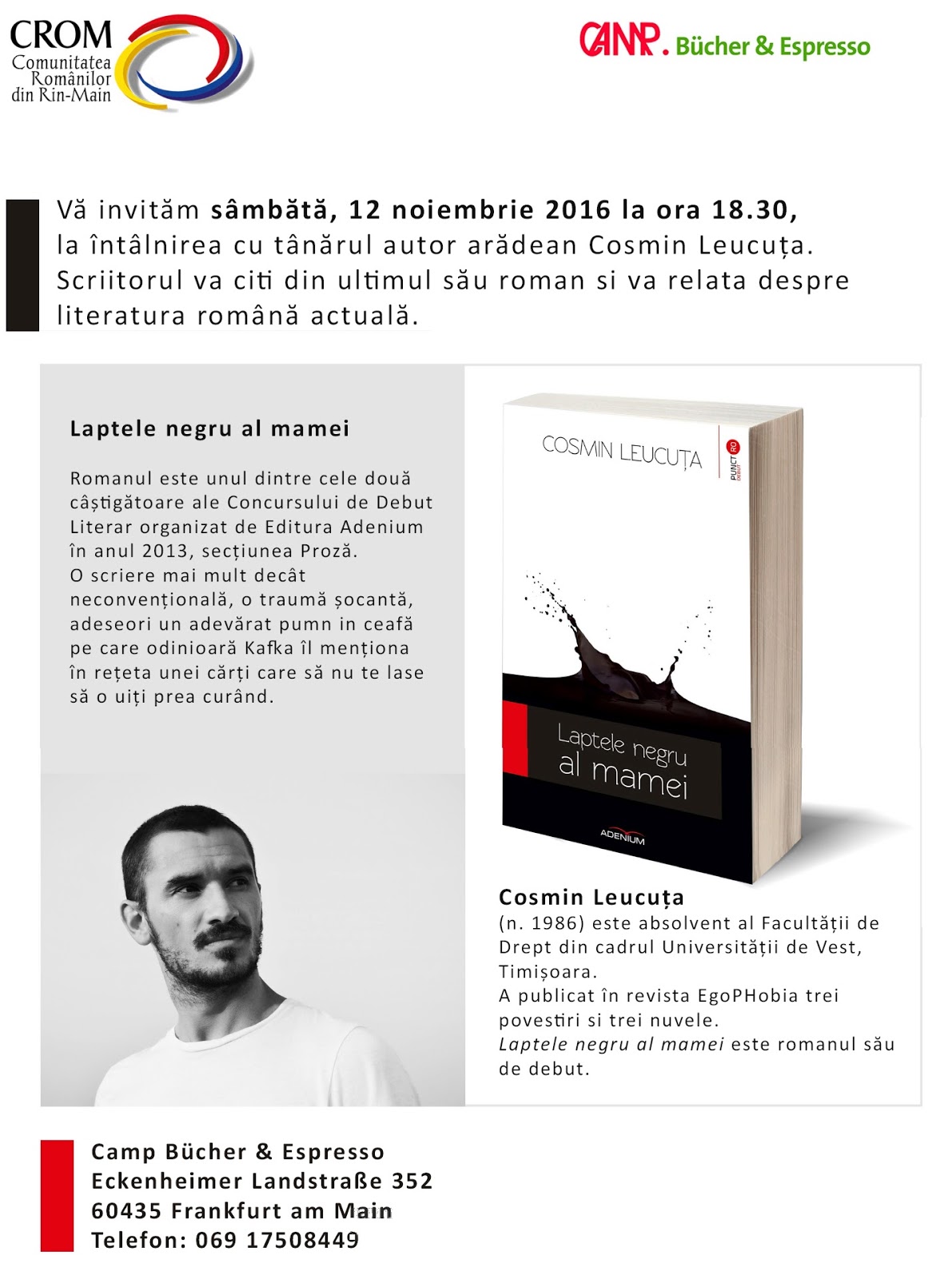 Intalnire la CROM cu un tanar scriitor roman - sambata, 12 noiembrie 2016, 18.30 h la libraria CAMP din Frankfurt Solicitați un link Facebook X Pinterest E-mail Alte aplicații Solicitați un link Facebook X Pinterest E-mail Alte aplicații